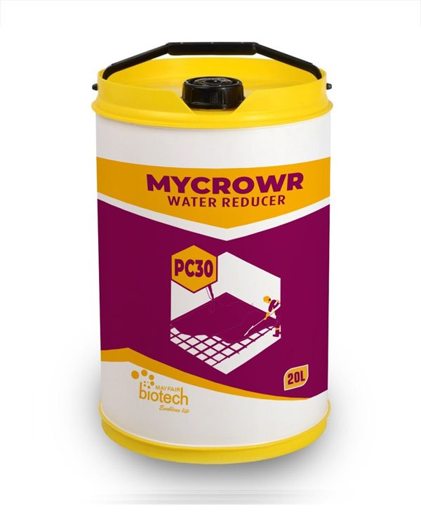 MYCROWR – PC30 is a Polycarboxylate Ether (PCE) based water reducer admixture and supplied as a brown liquid instantly dispersible in water. This generally improves cement dispersion. At the start of the mixing process an electrostatic dispersion occurs due to which cement particle's capacity to separate and disperse increases. This mechanism considerably reduces the water demand in flow able concrete.